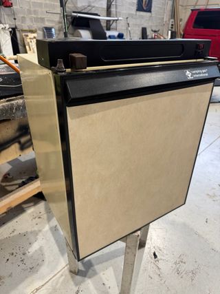 Nevera trivalente de la marca Campingaz International. Ideal para camping o viajes. Es de una caravana antigua, enfria muy bien a gas a 220v y a12v Medidas: alto 60cm Ancho 48cm Fondo 44 sin contar la puerta Frigorifico, absorcion, autocaravana, camping, camper, - Color beige y negro. - Diseño compacto.
