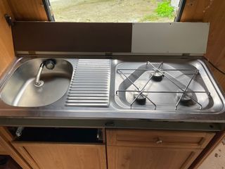 se vende cocina con fregadero ideal para caravana o camper.sin el mueble.la cocina consta de 3 hornillos de butano. mandos incluidos