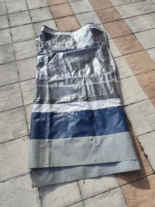 Avance de invierno para caravana de 4'80m. El avance no tiene desperfectos, no obstante como se puede apreciar en las fotos se nota el uso del mismo, de ahí el precio. - Material resistente y duradero. - Diseño en varios tonos de gris y azul.