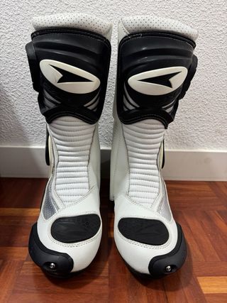 Botas de moto AXO Primato EVO en color blanco y negro. Diseñadas para ofrecer protección y comodidad en la conducción. - Modelo: MS2R0011 WK - Talla: 40 - Código: ACQPF2014160 - Certificación EN13634:2010 - Color blanco y negro. - Cierre con velcro y cremallera. - Protecciones en tobillo y espinilla. - Suela antideslizante. - Un uso. Caja original con etiqueta en interior.
