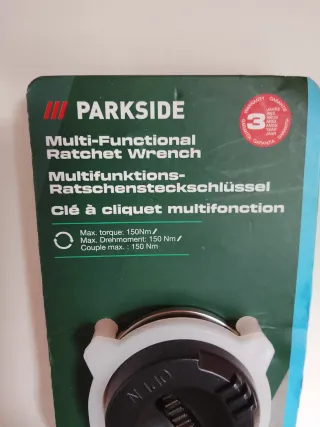 Llave de vaso y carraca multifuncional de la marca Parkside. Diseñada para diversas tareas. - Modelo: Multi-Functional Ratchet Wrench. - Máximo par: 150 Nm.