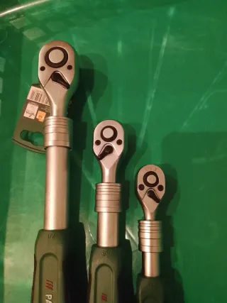 Set de tres carracas telescópicas de la marca Parkside. Son herramientas versátiles para diferentes trabajos. - Carraca de 1/2 pulgada. - Carraca de 3/8 de pulgada. - Carraca de 1/4 de pulgada.
