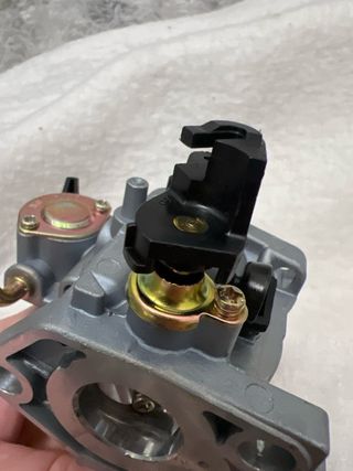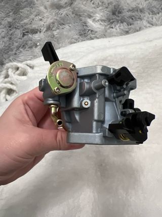 Carburador para motores de gasolina de 4 tiempos. Pieza metálica con palanca de control. - Cuerpo principal de color gris plateado. - Palanca de control de combustible negra. - Incluye conexiones de latón.