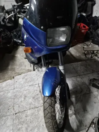 Carenado frontal para motocicleta BMW F650. El cabezon presenta una grieta lateral. Uno de los laterales con pintura saltada. - Color azul. - Incluye parabrisas negro. - Faro delantero.