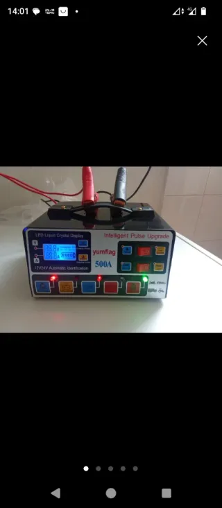 Cargador y reparador de batería inteligente de 12V para coche, moto y camión. Está nuevo y en perfecto estado. Carga todo tipo de baterías que no sean de litio. - Carga baterías de 12V. - Adecuado para coches, motos y camiones. - Sistema de carga por pulso inteligente. - Incluye pinzas. * 🛠️ Función de Reparación Automática: Olvídate de las baterías descargadas; este cargador de batería coche incluye una función inteligente de reparación automática que prolonga la vida útil de la batería. * 📊 Pantalla LCD Informativa: Con su pantalla LCD de fácil lectura, mantén el control total del proceso de carga, voltaje y diagnóstico de batería