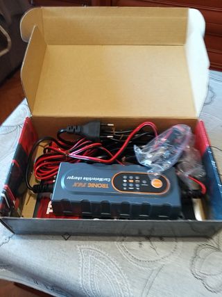 Cargador de baterías inteligente, nuevo, de 6 amperios. Ideal para coches, motos y más. Es rojo y tiene una pantalla LCD. - Carga rápida y eficiente. - Reparación por pulsos. - Parada automática. - Carga separada para invierno y verano. - Incluye pinzas.No negociable