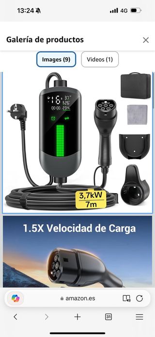 Cargador de vehículo eléctrico Wallbox de alta velocidad y alta potencia. 7.4 kilowatios = 32 amperios, monofásico. Cable de 7 metros de largo. Necesita un enchufe especial de 32 amperios o instalación fija. Creo que se puede usar con un adaptador a un enchufe normal pero a la mitad de potencia. Programable para aprovechar horas de electricidad más barata. Se puede recoger en el Cabanyal o en Catarroja, también hago envíos.