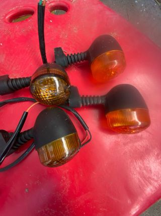 Conjunto de cuatro intermitentes universales para moto con carcasa negra y lente ámbar. - Lente de plástico ámbar. - Carcasa de plástico negro. - Conexión por cables.