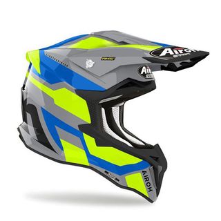 Casco de moto de la marca Airoh. - Diseño en gris, negro y detalles en amarillo neón. - Visera integrada.