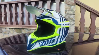 Casco de moto Airoh WRAPP en talla L. Diseño llamativo con detalles en azul, blanco y amarillo neón. - Cierre de doble anilla. - Visera aerodinámica. - Interior cómodo y transpirable. Usado pero en buen estado con signos de uso visibles en fotos