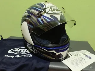 Casco de moto Arai con diseño especial. - Firmado por Johann Zarco y ricciardo rossi. - Visera azul tintada. usado dos veces y me le firmaron funda original de arai también tengo la visera trasparente