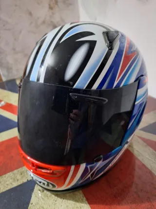 Casco de moto Arai en talla L, con muy poco uso. Presenta un diseño llamativo con detalles en blanco, azul, negro y rojo, inspirado en la Union Jack. - Talla L - Poco uso