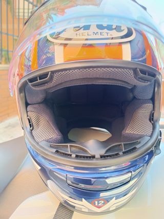 Casco de moto Arai del piloto Maverick Viñales, talla L. Está en muy buen estado y tiene un diseño impresionante. Usado 2 veces - Modelo: Arai RX-7V - Talla: L - Diseño: Maverick Viñales