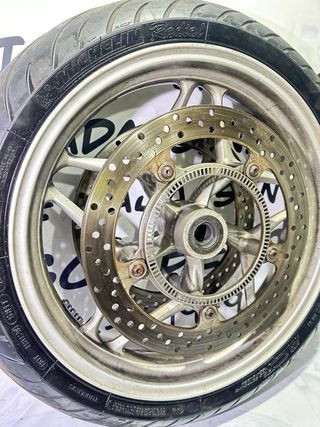 Rueda delantera para BMW R1200RT. Incluye disco de freno. - Llanta de aleación. - Neumático Michelin. LLANTA CON CUBIERTA! SIN DISCOS NI ABS. DISCOS Y ABS: 130€ Lo que se ve en las fotos. BMW R1200RT 2010 Más accesorios, 🪖cascos, 🧤ropa y 🛵piezas de recambio en mi perfil!! 🚚 Se hacen envíos: + 24/48 horas. + Contrareembolso No dude en contactar con nosotros… 📞 644-899-948 Compramos todo tipo de motos!!!