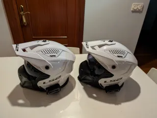 Dos cascos LS2 de color blanco y negro, ambos equipados con intercomunicador. - Marca: LS2 - Color: Blanco y negro - Incluye intercomunicador