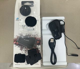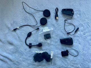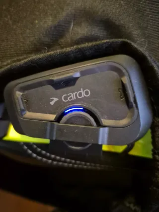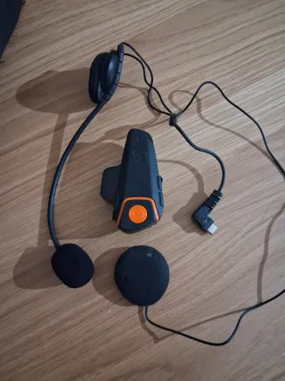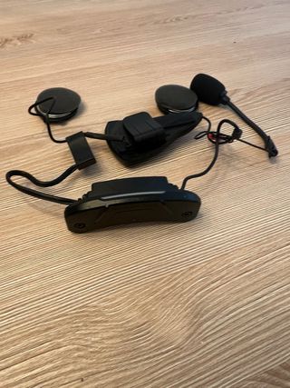 Sistema de comunicación Cardo Spirit para cascos de moto. Incluye lo que se ve en la foto. Se me cayó el casco con el comunicador y uno de los botones va blando, pero funciona, de ahí el precio.