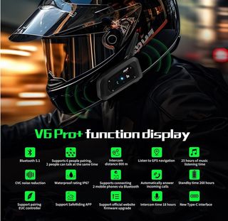 Pack de 2 intercomunicadores para casco de moto. Modelo EJEAS V6 Pro+ actualizado en 2024, mejorado y con conector USB Tipo C. Producto totalmente nuevo. Incluye: * 2 dispositivos * 2 auriculares con micrófono *2 soportes y clips * 2 cables de carga * Almohadillas de recambio * Manual Se conectan para hablar entre motos mientras conduces. También conectan al móvil por Bluetooth para llamadas, asistente del móvil, escuchar música o indicaciones del GPS.