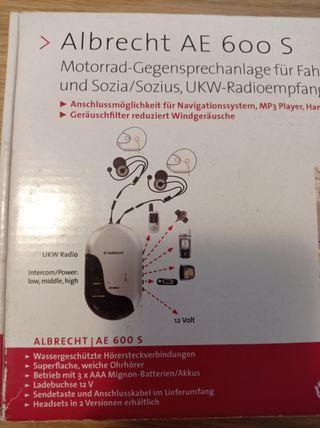 Intercomunicador alemán de alta calidad para moto Albrecht AE 600S, en muy buen estado. - Intercomunicador para piloto y pasajero. - Sistema activo de reducción de ruido. - Conexión audio para sistema de navegación, mp3, movil o walkie-talkie. -Radio incluida. - Incluye 2 parejas de auriculares planos con micrófono anti-viento para instalar en casco con velcro adhesivo. - Funciona con 3 pilas AAA o con adaptador de 12V. -En caja original.
