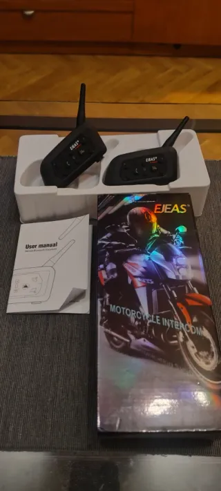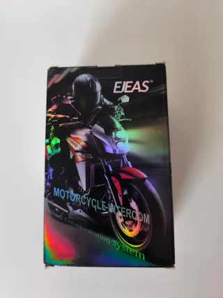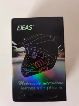 Set de dos intercomunicadores EJEAS para casco de moto. Incluye manual de usuario y caja original. - Dos unidades de intercomunicador. - Diseño compacto y ergonómico. - Antena integrada.