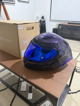 Casco de moto Nexx X.R3R Fibra de carbono. Talla M. Color Morado. Atencion Tiene un leve arañazo en el alerón trasero que se hizo al rozar una pared, se puede ver en las fotos. La calota está perfecta. El casco fue comprado en agosto de 2025 y se ha usado un total de 3 dias distintos!, prácticamente sin uso, aún huele a nuevo. Tiene los dos visores, transparente y morado + Pinlock sin poner. Incluye intercomunicador Cardo Spirit NUEVO, este no tiene uso. El alerón nuevo se puede adquirir por 45€ aproximadamente. Se puede ver y probar sin compromiso. NO se envia. Abstenerse ofertas ridículas