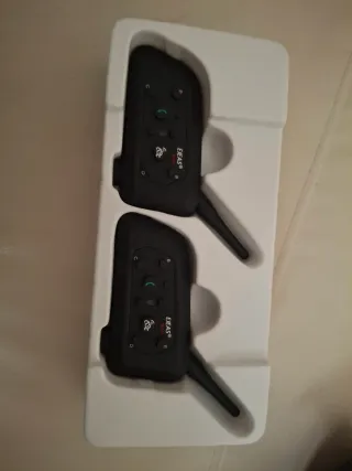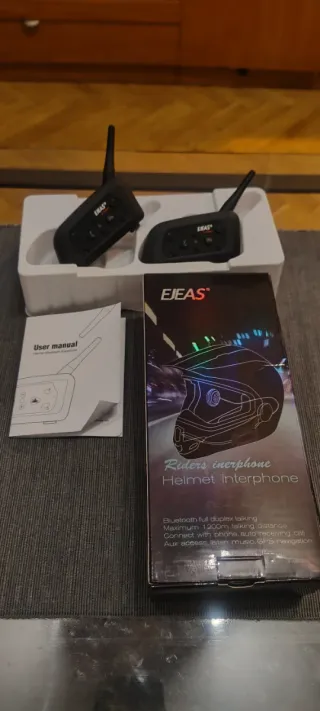 Pack de dos intercomunicadores Ejeas V6 pro+ totalmente nuevos, nunca se han vinculado y solo han salido de la caja para realizar las fotos y comprobar que los auriculares funcionan. Es la nueva versión del modelo V6 pro de Ejeas con conector tipo C y auriculares más compactos para facilitar la instalación en todo tipo de cascos. Tienen batería de larga duración, totalmente impermeables, conectividad hasta seis motos...etc. Si estás interesado y tienes alguna duda pregúntame