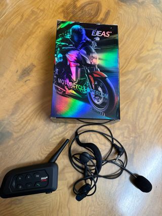 Intercomunicador NUEVO Ejeas V6pro+ Intercomunicador Ejeas V6 pro+ totalmente nuevo, nunca se ha vinculado y solo han salido de la caja para realizar las fotos y comprobar que los auriculares funcionan. Es la nueva versión del modelo V6 pro de Ejeas con conector tipo C y auriculares más compactos para facilitar la instalación en todo tipo de cascos. Tienen batería de larga duración, totalmente impermeables, conectividad hasta seis motos...etc. Si estás interesado y tienes alguna duda pregúntame