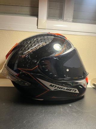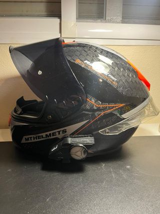 Casco de moto MT Helmets modelo Rapide Pro Master en color negro. Presenta un diseño deportivo con detalles en naranja y plateado. - Diseño Rapide Pro Master. - Acabado negro con detalles gráficos. - Marca MT Helmets. -carcasa con fibra de carbono -Ventilaciones superiores -Talla L Incluye intercomunicador ya instalado y funda original