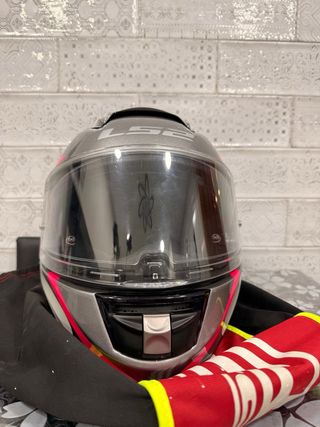 Casco de moto con un diseño llamativo en gris y detalles en rosa. Bolsa protectora incluida Talla XXS - Diseño deportivo. - Visera transparente. - Cierre de seguridad.