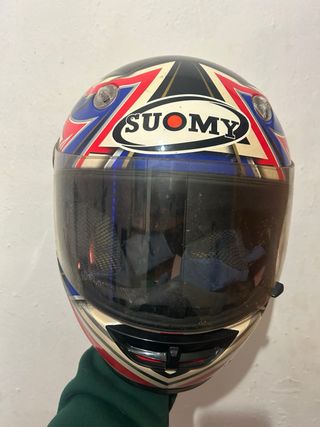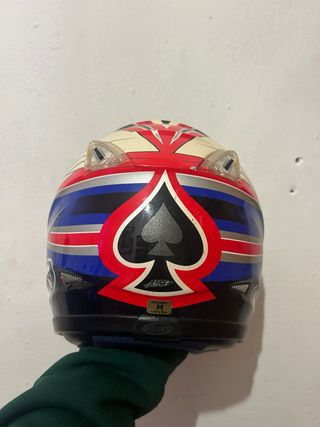 Este modelo destaca por combinar tecnologías desarrolladas en competiciones de MotoGP y F1: - Talla M. - Diseño con naipe de picas y Union Jack. - Visera transparente. - Marca SUOMY.