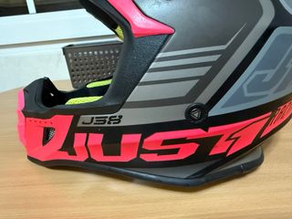 Casco de motocross de la marca Just1. - Diseño en color rosa, gris y negro. - Detalles en color verde lima en el interior. - Visera pronunciada. Casco motocross Just1 usado solo dos veces. Diseño llamativo en negro y rosa. Interior acolchado cómodo y ventilado, desmontable y lavable. Visera larga, cierre seguro y homologación europea. Ideal para motocross o enduro.