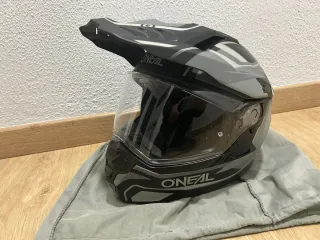 Casco aventure O'Neal en color negro y gris, diseñado para motocross, enduro y trail. Prácticamente nuevo, visera fácilmente desmontable, pantalla solar incorporada, talla M, se entrega en su caja original y funda de tela, las unicas marcas de uso que tienen son las que pongo en las fotos, una pequeña marca en la zona trasera y la polipiel de la parte baja un poco agrietada, nada que afecte a su uso o estética.