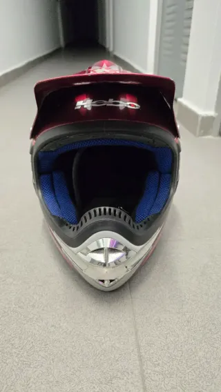 Casco de motocross de la marca Hebo en color rojo. Talla XL - Diseño deportivo con estrellas blancas. - Visera aerodinámica. - Interior con acolchado azul.