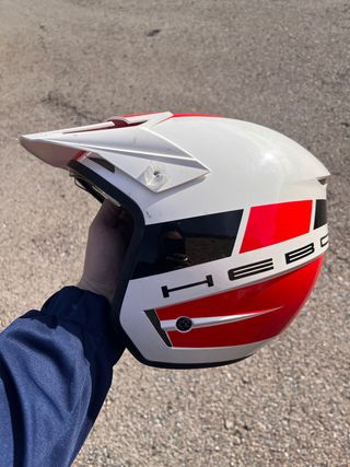 Casco de trial de la marca Hebo en talla M. Diseño moderno y ligero. - Color blanco con detalles en rojo y negro. - Visera aerodinámica. - Cierre de seguridad.