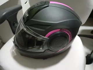 Casco integral talla s para moto con un diseño moderno y llamativo. - Color principal negro con detalles en rosa. - Visera transparente. - Visera para el sol integrada - Homologación ECE R 22.05. Muy cómodo, lo vendo porque hemos sido papás y hemos vendido la moto