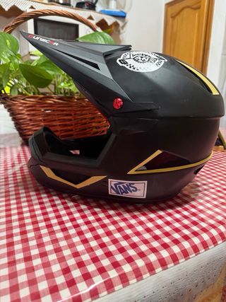 Casco integral negro para motocross o bicicleta de montaña (MTB). Presenta un diseño llamativo con detalles gráficos. - Color: Negro - Diseño: Gráfico blanco - Estilo: Integral Son 2 cascos infantiles, tienen marcas del uso. 40 cada uno, si te llevas los 2 te los dejo en 70€