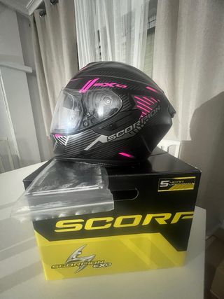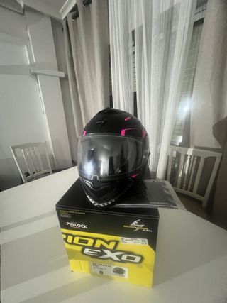 Casco integral Scorpion Exo 1200 Air talla Xs 54cm con un diseño llamativo en negro y rosa en muy buen estado comprado hace un par de años y usado 4 veces.Con visera de color rosa (original 45€), también incluye visera transparente con pinlock. -Gafas incorporadas. -Cierre de doble hebilla. - Calota exterior aerodinámica. - Visera con tratamiento antivaho. - Interior extraíble y lavable.