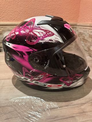 Casco integral LS2 Flutter original Talla S – ideal para mujer o cabeza pequeña Color rosa / negro con diseño de mariposas 🔧 Características • Certificación ECE R22-05 • Peso aprox. 1350 g (ligero) • Cierre micrométrico • Ventilación superior • Visor transparente • Conector interior para micrófono / intercom 🧼 Estado • Segunda mano • Muy poco uso • Interior limpio y acolchados en buen estado • Visor sin rayones importantes Se vende por no uso. Precio ajustado para venta rápida, sin mareos. Entrega en mano o envío por Wallapop.