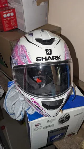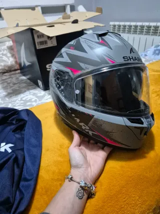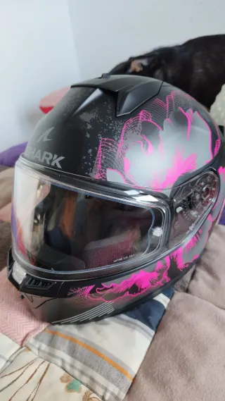 Casco integral Shark Ridill 2 Assya en color negro y rosa. - Talla M. - Diseño deportivo y llamativo. - Pantalla oscura incorporada en casco - Seminuevo, comprado en Junio y usado un par de veces por semana hasta Octubre. Se ve perfecto, lo vendo porque ya no le doy ningún uso, al igual que a mis estriberas traseras jajajaja Tiene los auriculares y base de Ejeas V6 Montado, pero lo vendo sin el aparato.