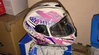 Casco de moto integral con diseño llamativo y visera de espejo. Precio algo negociable. - Nuevo a estrenar con la etiqueta. - Talla S. - Visera con acabado iridiscente. - Diseño con detalles en rosa, morado y amarillo.
