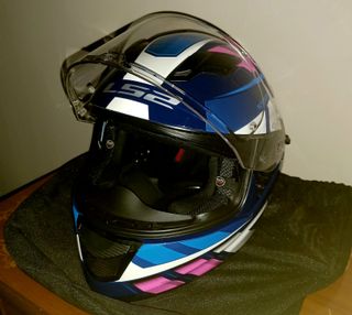 Casco integral LS2 con un diseño llamativo y moderno. - Talla M. - Diseño con salpicaduras y patrones geométricos en morado, azul y rosa. - Visera transparente. -y visera interna para el sol Tiene alguna mancha de maquillaje en la esponja, pero por lo general está nuevo