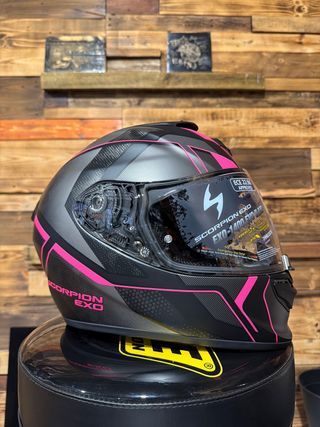 Casco integral Scorpion EXO-1400 con un llamativo diseño en rosa y negro. -Descuento ya aplicado -pinlock incluido - Talla L. - Homologación ECE 22.06. - Preparado para Pinlock.