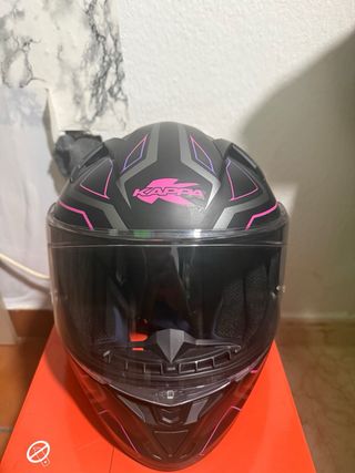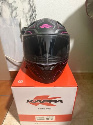 Casco integral de moto de la marca Kappa, con un diseño moderno y llamativo. - Color negro mate con detalles en rosa y gris. - Visera transparente. - Talla S. - Se entrega en su caja original. - Se entrega con facturas y ticket de compra. -Esta nuevo PRECIO NEGOCIABLE