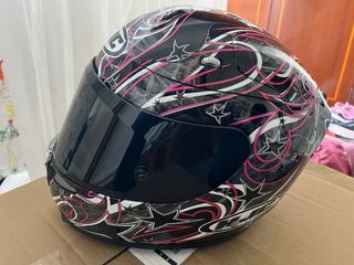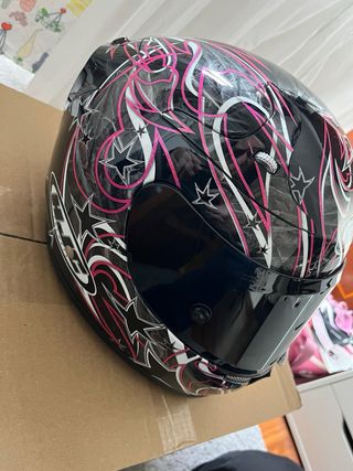 Casco integral HJC RPHA10+ con un diseño llamativo en negro brillo, rosa y blanco con estrellas. - Diseño con remolinos y estrellas. - Visera oscura sin estrenar. - Se da la visera clara con Pinlock. - Cierre de doble anilla. - Interiores recién lavados y revisados. - Estado impecable tanto exterior como interior, sin apenas uso. - Talla XXS, 2XS. - Se da la funda original y manuales.