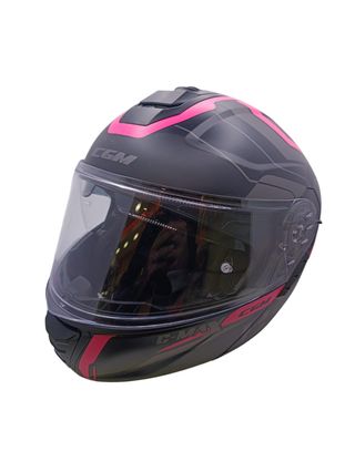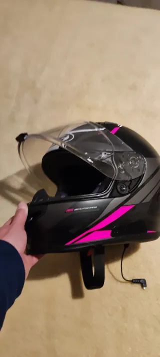 Casco de moto integral con diseño moderno y detalles en rosa. - Color negro con detalles gráficos en rosa y gris. - Visera transparente. - Sistema de ventilación. - Incluye intercomunicador. - talla S 56 - peso 1.350 gr