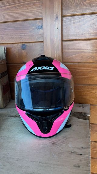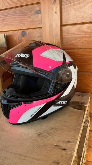 Casco de moto integral con un diseño llamativo en rosa, negro y detalles plateados. - Marca: AXXIS - Color: Rosa, negro y plateado - Visera transparente tiene unos arañazaso como ven en foto