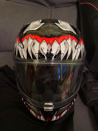 Conjunto de equipamiento para moto con diseño inspirado en Venom. - Casco integral con diseño venom, incluye visera negra y pinlock ya instalado - Mochila negra con espacio para el día a día o para guardar el caso - chaqueta talla L que incluye protecciones
