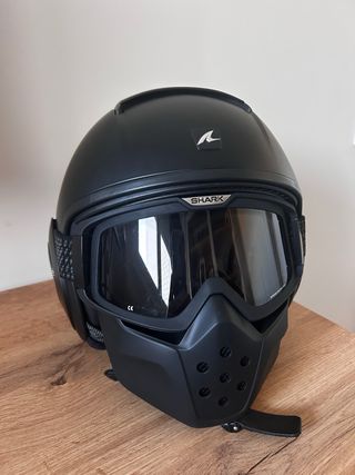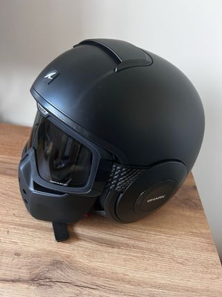 Casco integral Shark Jet negro carbono en acabado negro mate talla L. Diseño moderno y agresivo. - Visera oscura. - Máscara frontal extraíble. - Interior cómodo.
