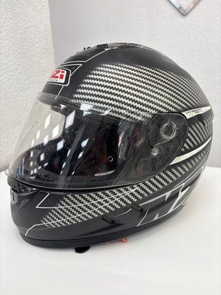 Casco integral HJC FG15 con diseño deportivo. Incluye barbillera y naricera. - Talla L - Color negro y blanco. - Visera transparente + visera ahumada intercambiable. - Cierre de seguridad doble hebilla Tiene marcas de uso, pero es perfectamente funcional.