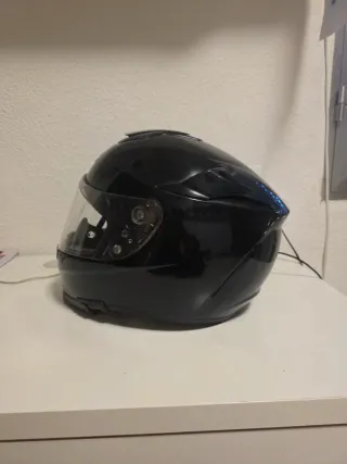 Casco integral Shoei Neotec II en talla L. Color azul mate. - Visera clara e interior oscura - Cierre de seguridad. - Diseño aerodinámico. Con marcas de uso ,incluye base anclaje intercomunicador Cardo. Cas