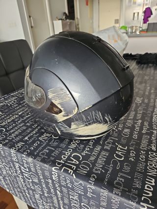 Casco para moto integral con mentonera abatible a una mano. Funda interior con desgaste evidente. de ahi el precio barato. Talla estimada L Funda proteccion de regalo